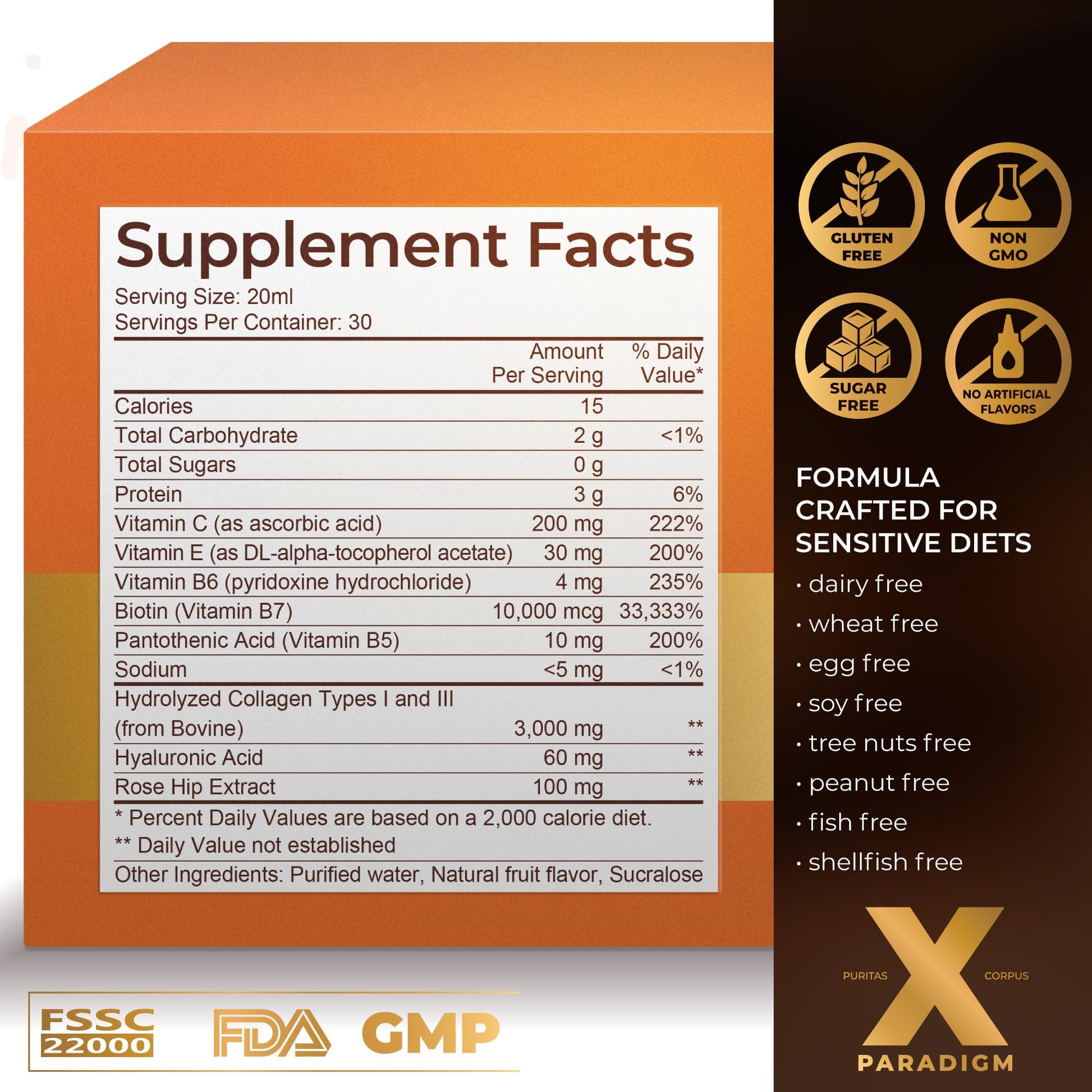 XParadigm Puritas Corpus Liquid Collagen Peptides with Biotin & Hyaluronic Acid - Hydrolyzed Bovine Collagen Type 1 and 3, Biotin 10000mcg, Vitamins B5, B6, C & E - Liquid Collagen for Women & Men