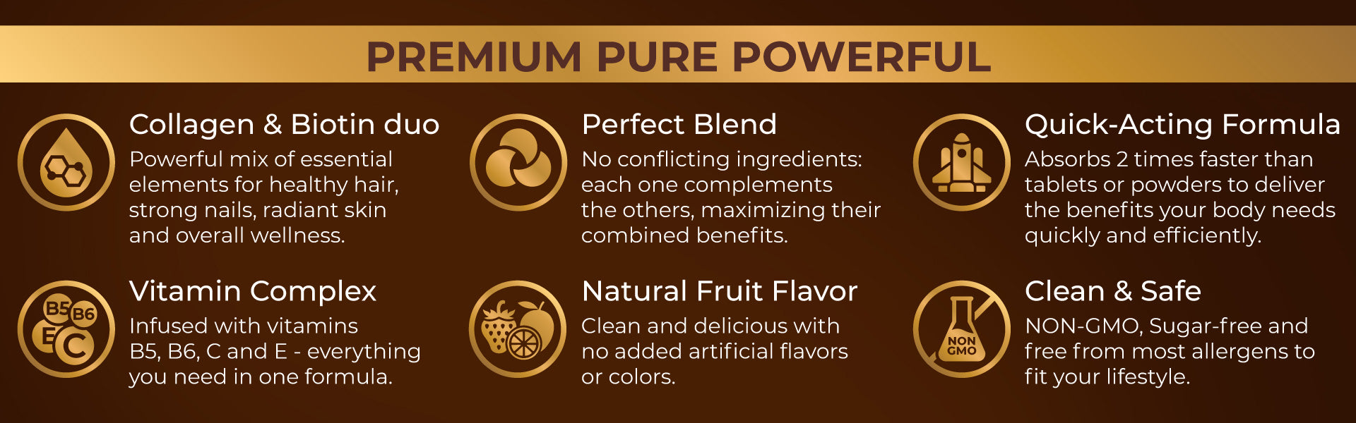 • ADVANCED LIQUID FORMULAHydrolyzed collagen, biotin, hyaluronic acid, and essential vitamins in a fast-absorbing liquid form. Easier than powders or capsules, this formula delivers nutrients quickly and efficiently for visible results.