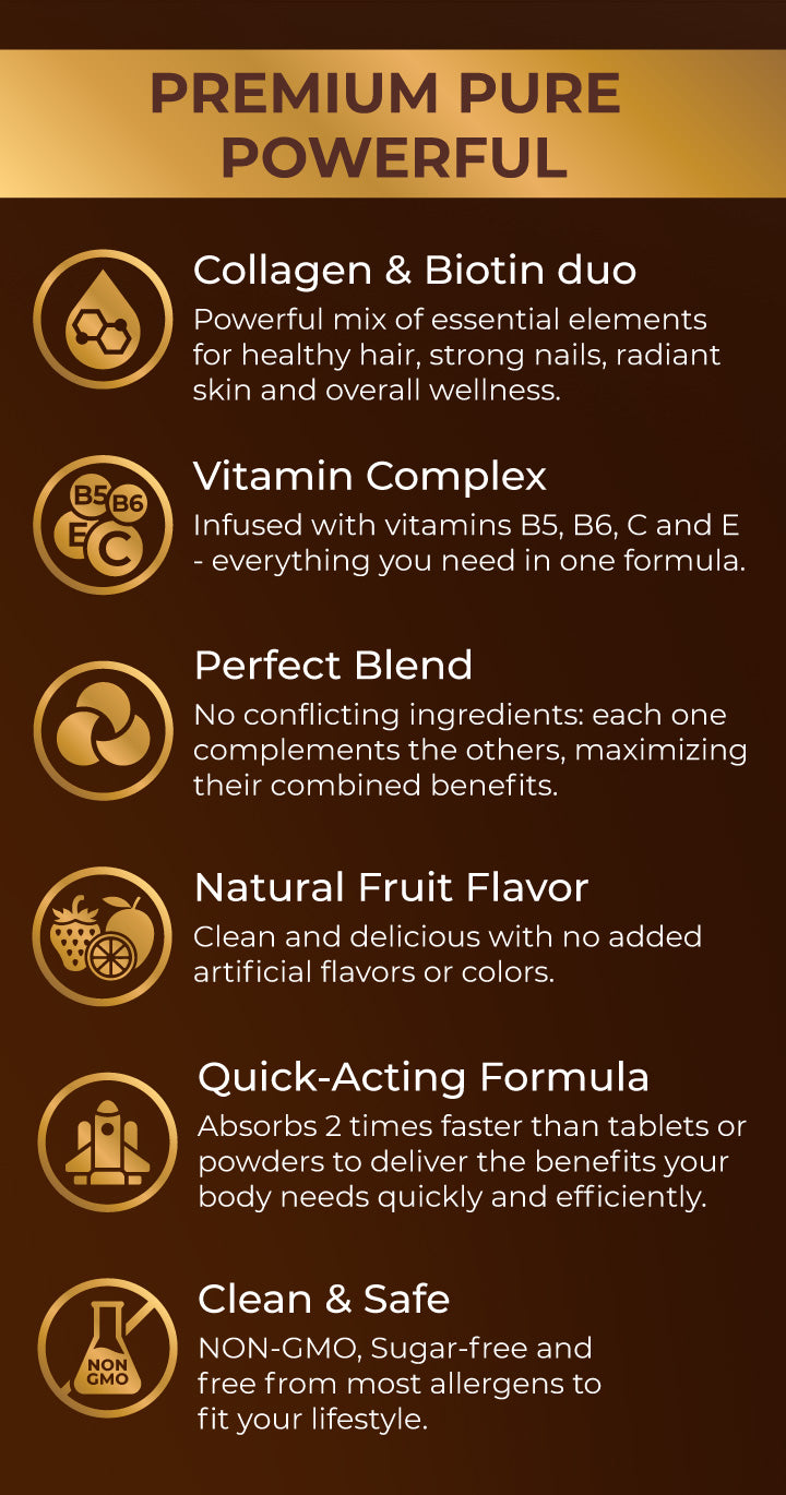 Each ingredient is chosen with purpose. Collagen, biotin, hyaluronic acid, and essential vitamins work in harmony — amplifying each other’s effects for maximum absorption and lasting results.