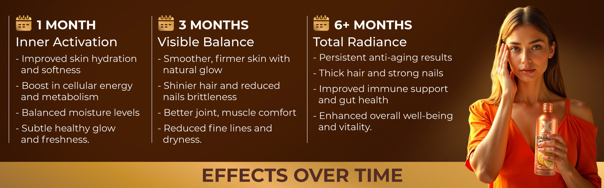 Visible improvements that deepen over time, as your body restores its natural rhythm. With each day, your skin regains elasticity, your hair grows stronger, and your body feels more resilient.